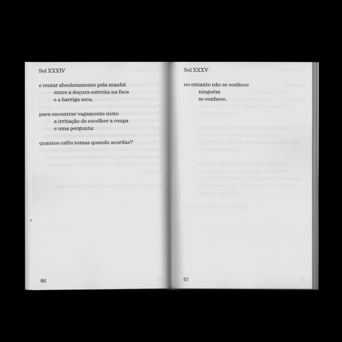 The Royal Studio, De Poche, aqui João Castro. Como um só, avançam num vaguear frenético por um lugar onde versos e formas desenham estórias, rastilhos para a vida: o real e o intangível, o material e o abstracto. E não havendo um tempo seguro para se olhar para o Sol, com vigor se evita o poente — a sombra é pesada e o corpo leve.