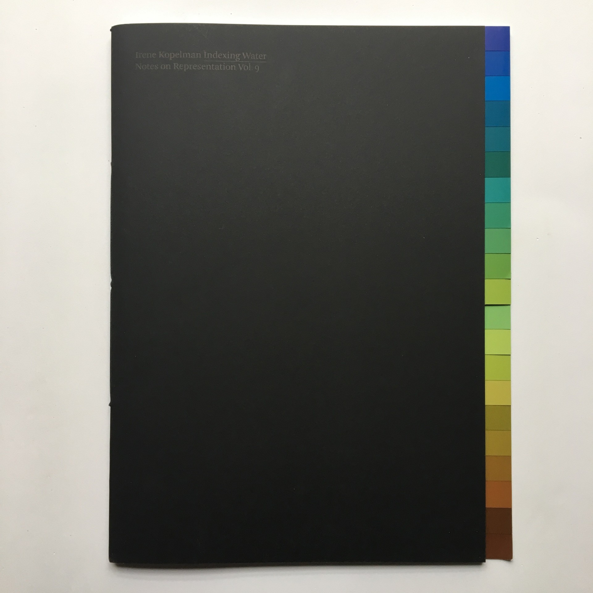 Este nono volume da série 'Notes on Representation' de Irene Kopelman é dedicado ao Dr. Marcel Wernand, um oceanógrafo físico cuja pesquisa trata da escala Forel-Ule, um índice portátil desenvolvido no século XIX para estimar a cor de corpos naturais de água como como lagos e mares. O livro em si funciona como a escala de Forel-Ule, reproduzida como material impresso em cores sólidas e opacas. Kopelman, fascinado por processos naturais e cujo trabalho explora a relação entre arte e ciência, também reúne e apresenta fragmentos dos escritos de Wernand e conversas gravadas que ocorreram em diferentes momentos em 2017.