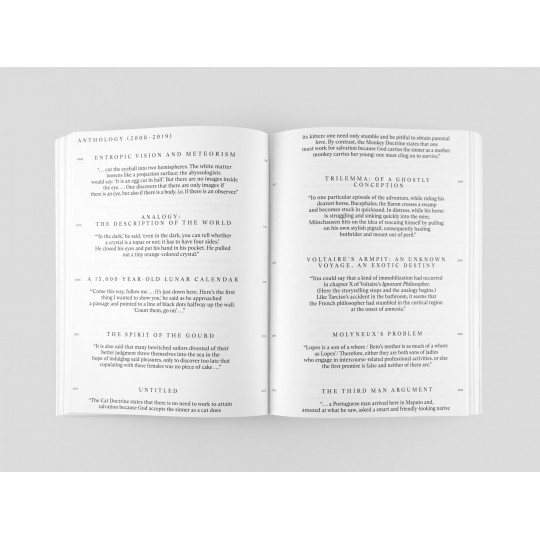 Acompanhados por ensaios inéditos - de Chris Fitzpatrick, curador independente, anteriormente Diretor de Objectif Exhibitions, Antuérpia, e do Kunstverein München, Anthony Huberman, Diretor e Curador Chefe do CCA Wattis Institute de San Francisco, e Philippe Vergne, Diretor do Museu de Arte Contemporânea de Serralves - que propõem leituras diversas de uma obra que, combinando registo antropológico, drama e pesquisa científica, se apresenta como uma investigação do insondável, uma forma de conhecimento esotérico que se materializa em “ficções poéticas e filosóficas”.