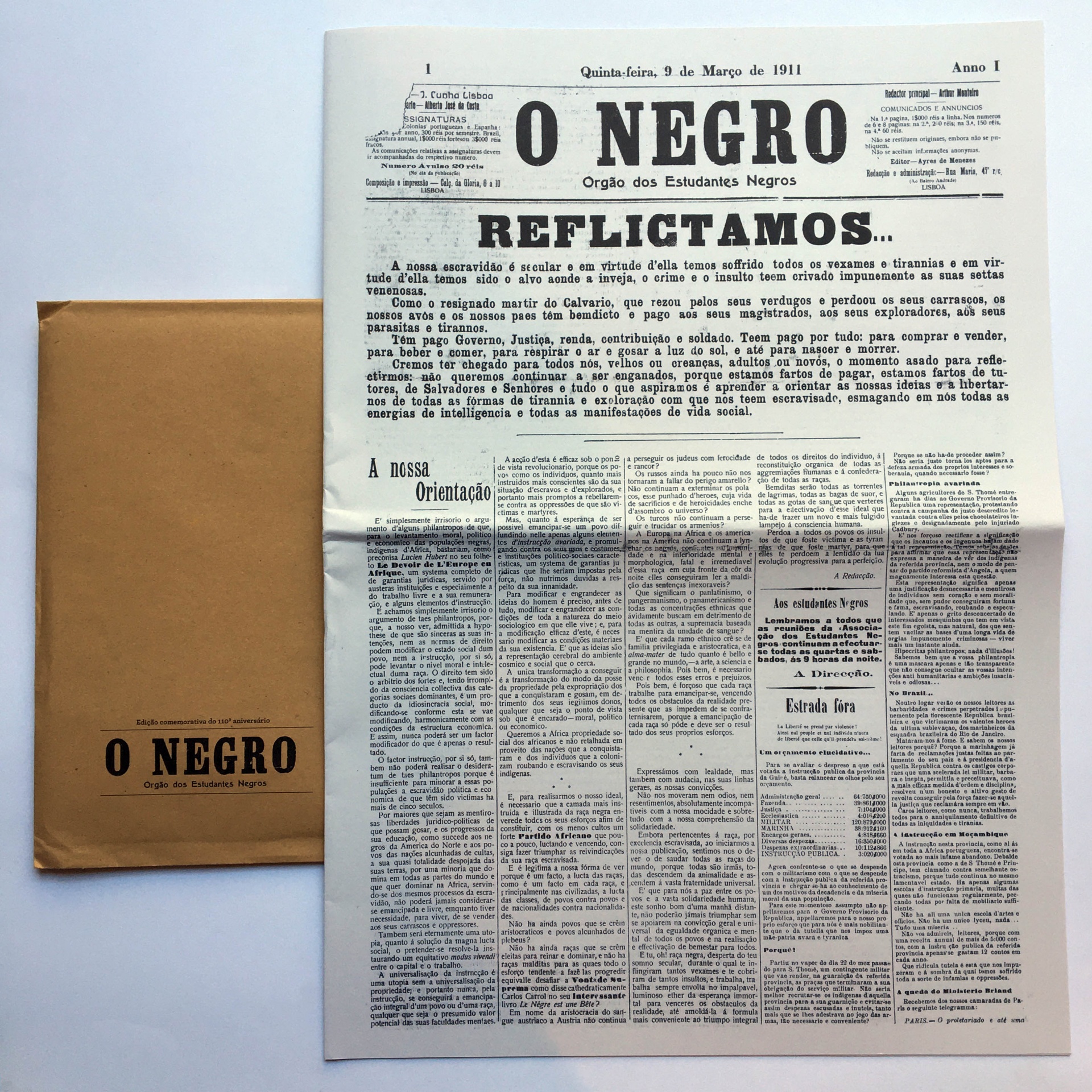 A 9 de março de 1911 era lançado em Lisboa o jornal O Negro: Órgão dos Estudantes Negros. 110 anos depois decidimos fazer uma reedição comemorativa dos três números desta publicação. Este foi o primeiro periódico de uma geração de ativistas que, durante 22 anos, se organizou em torno do pan-africanismo, da luta contra o racismo e da reivindicação de direitos para os territórios colonizados. Este jornal, que era dirigido por estudantes negros em Portugal, pretendia combater as «iniquidades, opressões e tiranias», apelava à construção de um partido africano e exigia da República o fim da desigualdade racial. Num momento como o actual, em que a sociedade portuguesa e outras entram numa intensa disputa sobre os legados coloniais e racismo, e em que os jovens negros são protagonistas de importantes movimentos sociais, a reedição d’O Jornal “O Negro: Orgão dos Estudantes Africanos”, dificilmente poderia ser mais oportuna. Trazer para o presente este jornal e revelar a importância do movimento de que ele fez parte é ferramenta imprescindível para questionar o silenciamento constante a que a história dos afrodescendentes e africanos é votada na sociedade portuguesa. É também homenagear e dar continuidade ao trabalho de Mário Pinto de Andrade que deixou pistas preciosas para que as gerações seguintes pudessem conhecer a sua presença multissecular em solo português e a resistência histórica de que são herdeiros. Assim sendo, reeditar O Negro 110 anos depois não se resume à comemoração de uma efeméride, mas é o exercício do direito à memória, que é, acima de tudo, um instrumento de combate antirracista na atualidade.