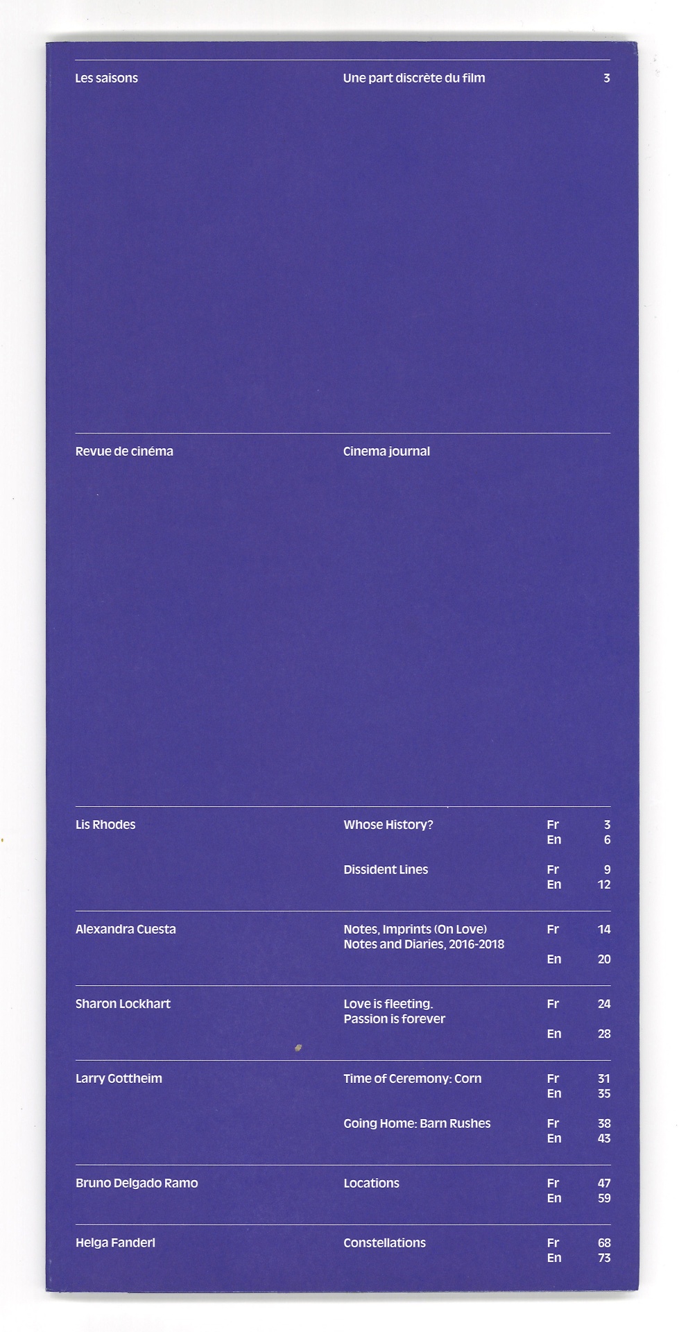 Les écrits que Les Saisons collecte naissent dans un espace de coalescence entre les mots et les images : le paysage masculin de l’histoire que Lis Rhodes rouvre à son appropriation irréductible, l’acuité magique dans la notation des souvenirs qui compose le texte d’Alexandra Cuesta, collectrice de traces, la visibilité du travail et de l’amour dont Sharon Lockhart interroge l’enregistrement, les morceaux d’existence qui se dégagent de la remémoration comme acte éperdu de conscience chez Larry Gottheim, le processus de l’écriture chez Bruno Delgado Ramo tel un peintre faisant sa palette, le trouble dans le temps à travers la somme d’aperçus abondants et lacunaires d’Helga Fanderl, collectrice de vues.