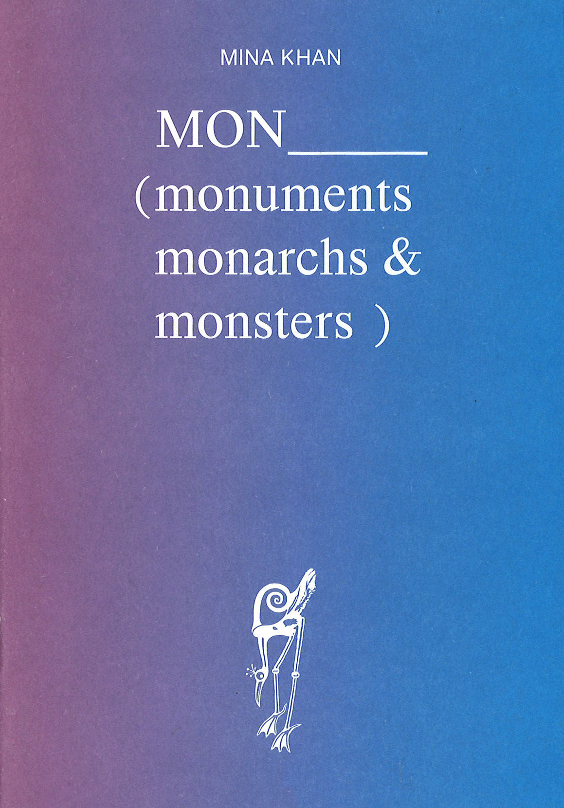 Trauma molds the collective memory that Mina Khan's poems relay in this debut collection of poetry, interlacing autobiographical examination with the rigor of researched fact. These poems rupture through a generational understanding between mother, father, and child, and rekindle old symbols through the ashes of contemporary seeing. If ancestry leads the poet toward massacre and war-torn worlds, MON's stunning autofictions recover the flaked past within living monuments.