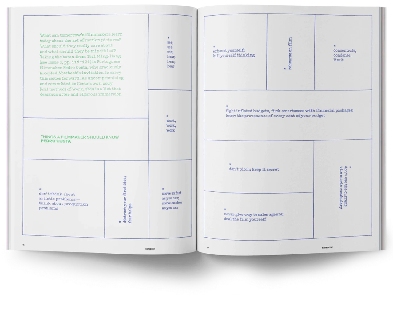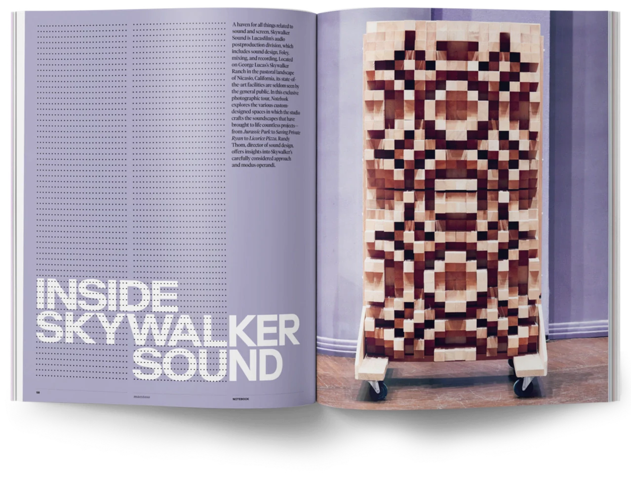 Notebook issue 4 explores cinematic soundscapes in their diverse sonic forms. Voices of artists are featured in a wide-ranging conversation between director Gus Van Sant (Elephant, Milk), composer Tamar-kali Brown (Mudbound, The Assistant, Shirley), and sound designer Leslie Shatz (Bram Stoker’s Dracula, Carol, Blonde), as well as a survey of contemporary filmmakers, including Garrett Bradley, Erik Matti, and Dominga Sotomayor, explaining their approaches to audio. We look at the state of accessibility for the visually impaired, and what its evolution may bring in the future, and hear about exciting approaches to silent film accompaniment by musician Julia Holter, benshi Ichiro Kataoka, and pianist Gerhard Gruber. Additional topics include tours of the world-class Skywalker Sound facility in Northern California and a Foley effects studio in Ireland. Other features range from a celebration of the gorgeous “100 Films, 100 Posters” art project in Jeonju, South Korea, to a personal reflection on brownface in American cinema, and a new installment by Pedro Costa (Vitalina Varela) in our “Things Filmmakers Should Know” series, and much more.