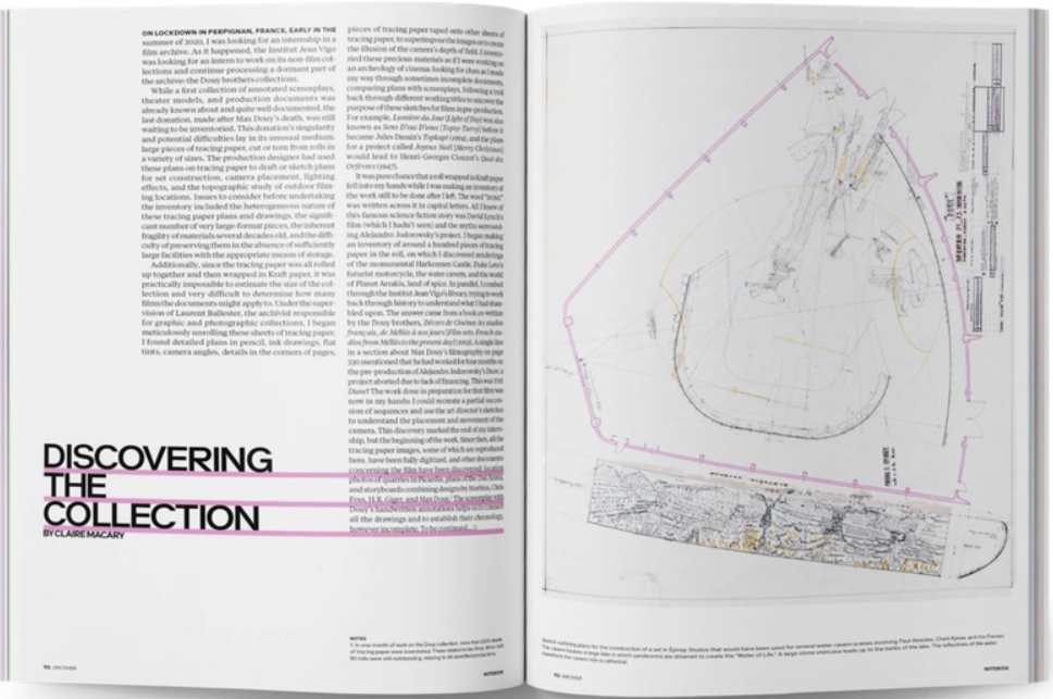 Also in the Issue is an expansive essay by Genevieve Yue exploring the intersection of racism, regional history, and Hollywood movie-making in the California foothills, and new contributions by Tacita Dean and Sergei Loznitsa in our ongoing “Things a Filmmaker Should Know” series. In addition, there are never-before-seen drawings by Max Douy from Alejandro Jodorowsky’s legendary but ill-fated adaptation of Dune, and a special, detachable artwork by Rosa Barba.