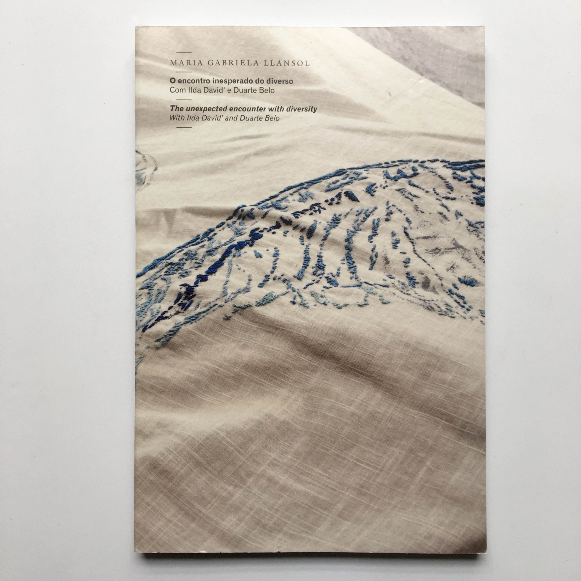 A exposição «O Encontro Inesperado do Diverso», que este livro vem documentar, inaugurou um ciclo de exposições dedicadas a poetas ou a universos literários próximos da poesia sem serem formalmente poesia. Maria Gabriela Llansol (1931-2008) construiu uma das obras mais fascinantes e enigmáticas do panorama literário contemporâneo, inesgotável na leitura do mundo, na fulgorização dos seres, na transfiguração da escrita. O título da exposição, «O Encontro Inesperado do Diverso», tomado de empréstimo ao livro Lisboaleipzig, é programático: representa, por um lado, a pluralidade e a abertura do projecto literário de Llansol, onde confluem outras obras, imagens e objectos reais e sonhados, em que a experiência da vida dá forma à escrita e em que a performatividade da escrita se verte no vivido quotidiano, reinventando-o, repropondo-o; e, por outro lado, é metarepresentativo do encontro em que se constitui a própria exposição, para onde convocámos dois outros universos autorais, da artista Ilda David’ [n. 1955] e do fotógrafo Duarte Belo [n. 1968], que conheceram Maria Gabriela Llansol e com quem colaboraram. Os trabalhos de Ilda David’ e Duarte Belo são, em Portugal, daqueles que mais íntima e aprofundadamente têm convivido com a literatura, mantendo um diálogo permanente com diversos autores dessa área ou tomando a escrita como matéria de inspiração. Assim, através da pintura, da gravura, do mosaico, do bordado ou do desenho, atravessados por personagens e objectos do livro, entre planos de representação e de corporalização, procura-se o sulco inscrito pela escrita de Llansol. Em contraponto, as fotografias propõem o espaço quotidiano e encenado da escrita, tornam presentes, apesar de distantes, as coisas e o tempo delas, todo um imaginário. «O Encontro Inesperado do Diverso» é uma experiência que transporta, para o espaço físico e codificado do museu, o lugar da apresentação, o espaço encapsulado e mágico do livro e, mesmo arriscando o desencontro ou a paralaxe, tentando dar corpo à voz interior da escrita e procurando o milagroso. [Nuno Faria]