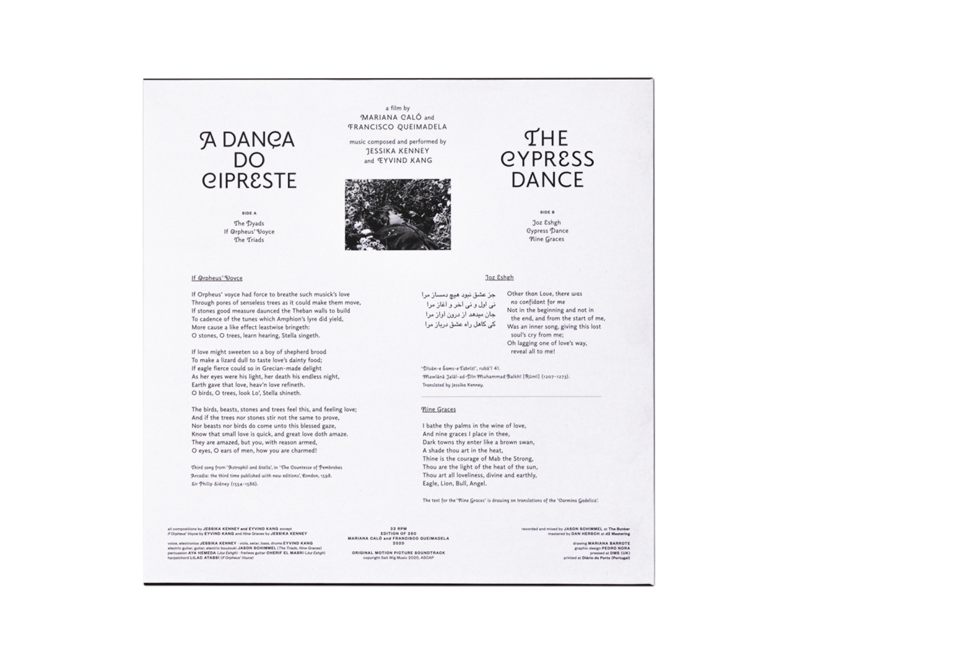 All compositions by JESSIKA KENNEY and EYVIND KANG except If Orpheus’ Voyce by EYVIND KANG and Nine Graces by JESSIKA KENNEY